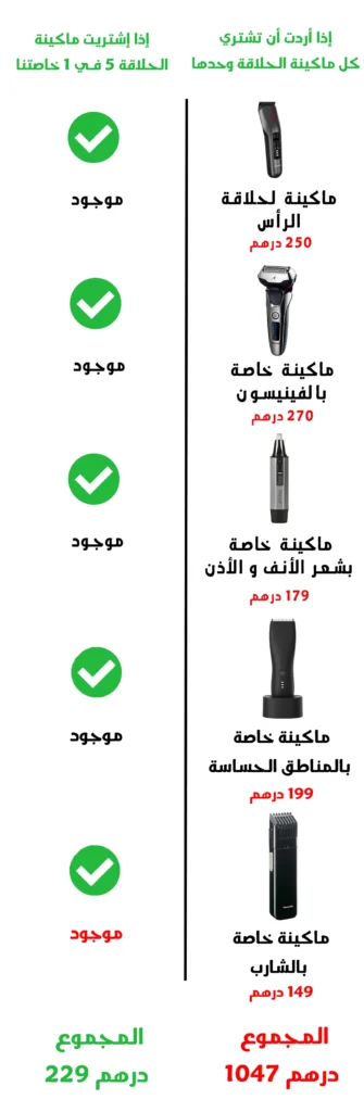أولا دعني أقارن لك كم ستوفر من المال إذا كنت تملك ماكينة الحلاقة 5 فــــي 1 الخاصة بنا